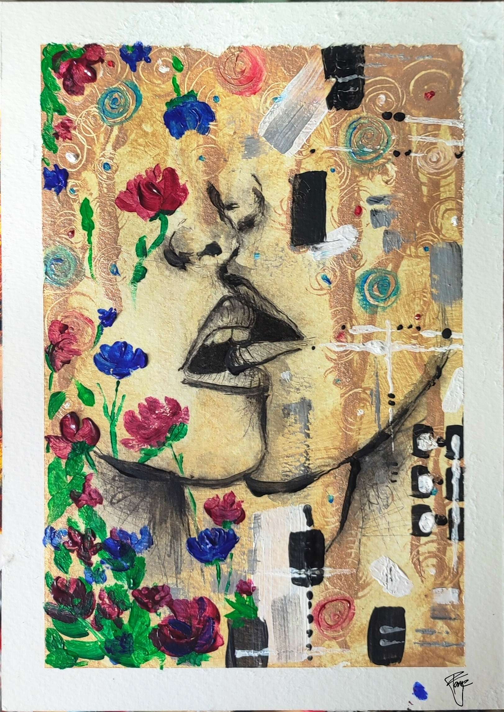 tohle byl pro mě v prvních chvílích oříšek, protože jsem neměla absolutně žádný nápad. Nakonec jsem se rozhodla sepsat si pár základních slov, od kterých bych se tedy trochu odpíchla – konkrétně to byl polibek, květiny, spirály, čtverce a obdélníky a zlato. A najednou už to bylo mnohem snazší, koukat na slova než přímo na originální obraz. :D